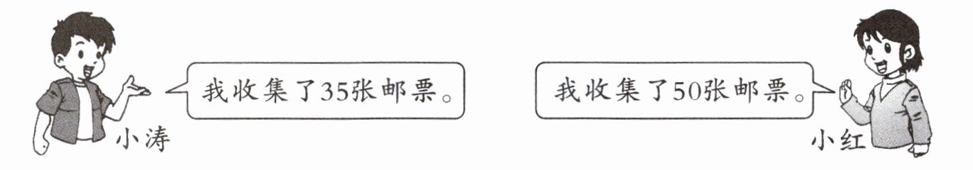 【解析】:要求小涛和小红一共收集了多少张邮票,只需要将小涛收集的邮票数和小红收集的邮票数相加即可。已知小涛收集了$35$张邮票,小红收集了$50$张邮票,所以可列出算式$35 + 50$。