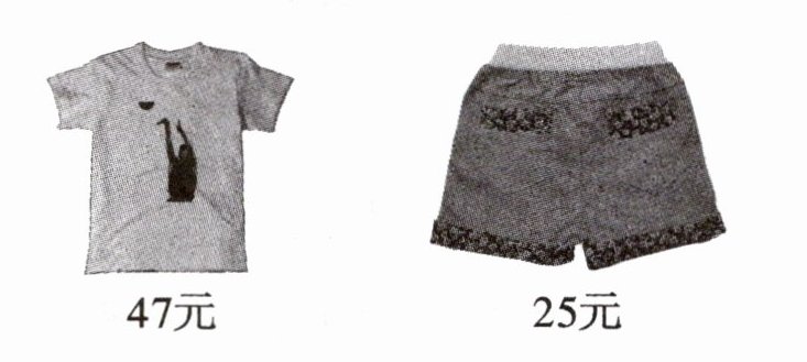 已知T恤$47$元,短裤$25$元,可列出算式$47 + 25$。