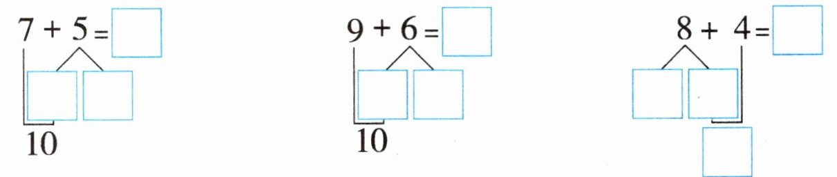 第一题:计算$7 + 5$,把$5$分成$3$和$2$,先算$7+3 = 10$,再算$10+2 = 12$,所以方框里依次填$3$、$2$、$12$。