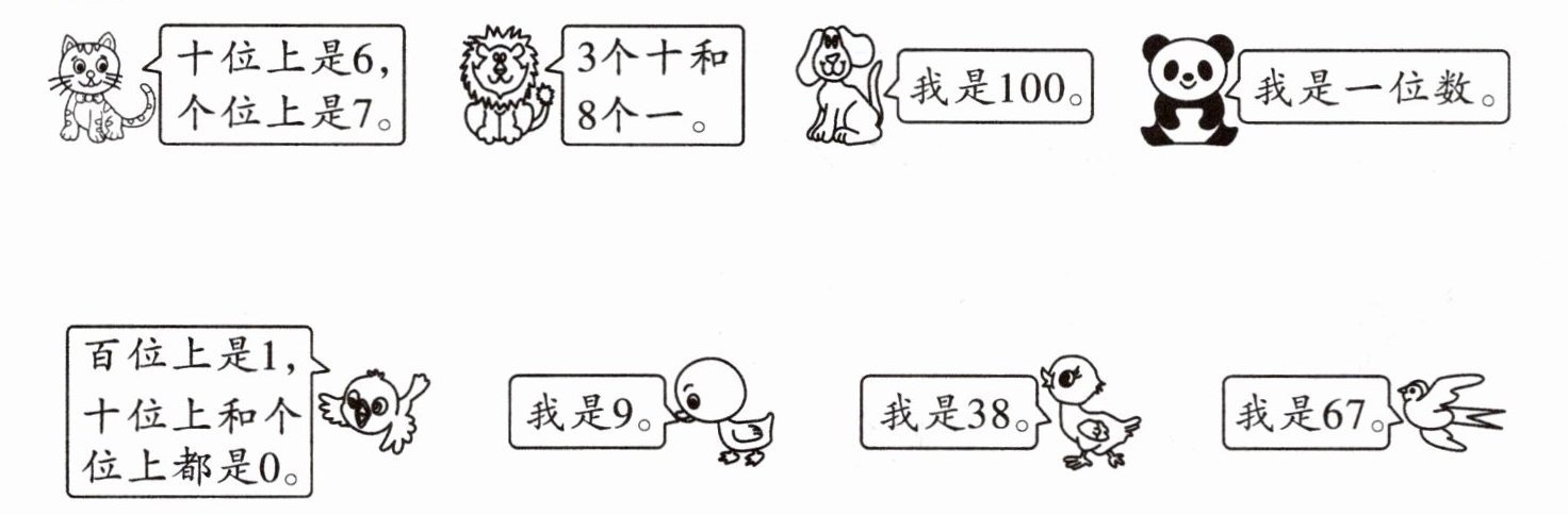 【答案】:小猫—我是67;狮子—我是38;小狗—百位上是1,十位上和个位上都是0;熊猫—我是9
