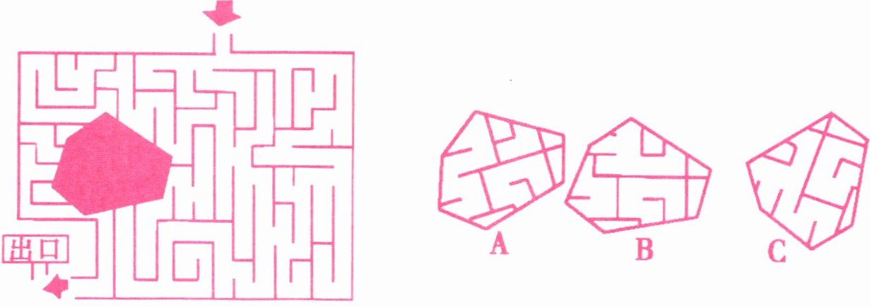 【解析】:观察迷宫原图,入口在上方箭头处,出口在左下角。残缺部分(粉色区域)为不规则多边形,需从A、B、C中选择能连接入口到出口路径的图案。