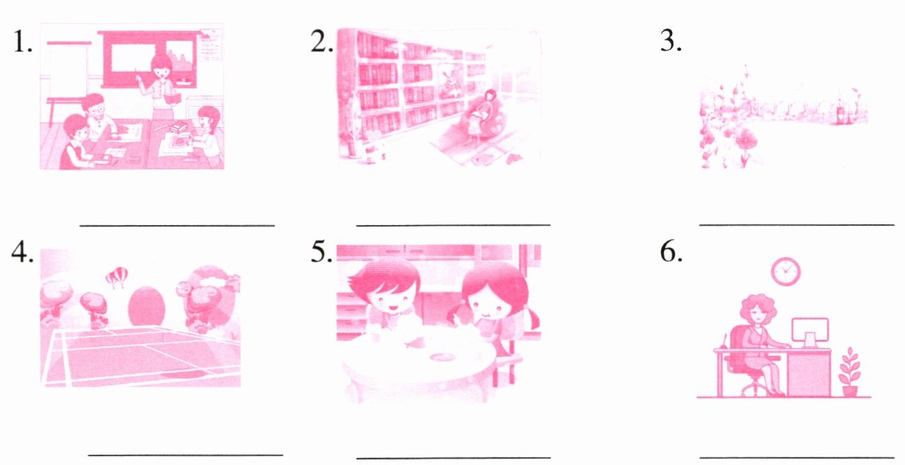 1 小朋友们,先来参观一下我们的校园吧。(给下列地点选择正确的名称)