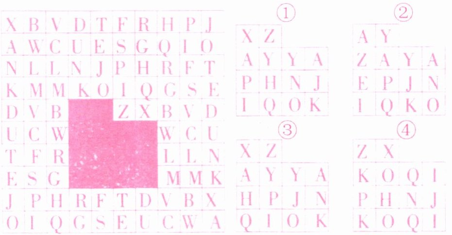 学校食堂的地面坏了一大块,我们必须尽快把它修补好,请你也来帮帮忙。这块地面是用100块瓷砖铺成的,每块瓷砖按一定的逻辑顺序标上了字母。请问应该用右边哪一组瓷砖来补这块地面呢?