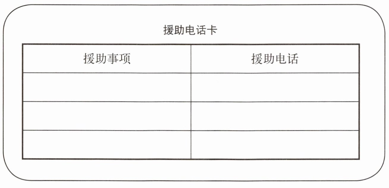 5. 遇到事故时,我们可以通过拨打哪些电话获得相关部门的援助?查阅资料,设计一个援助电话卡。