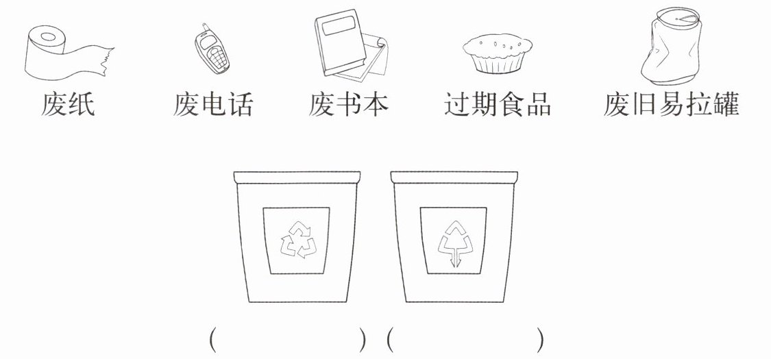 (1) 请你根据垃圾箱上的标志,在图片下的括号里,填写哪一个是可回收物垃圾箱?哪一个是不可回收物垃圾箱?并用连线的方式将垃圾分别放入两个垃圾箱。