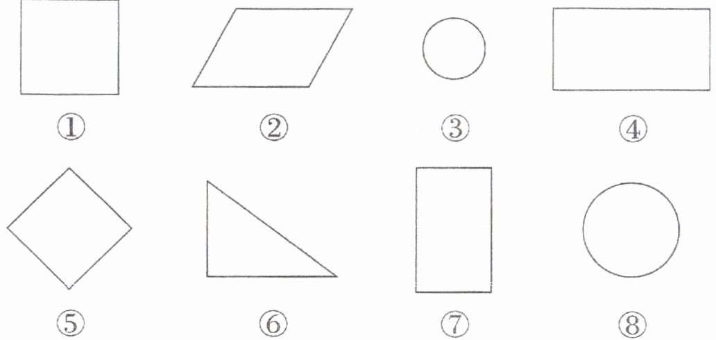 【解析】:观察图形可知,图形①和⑤的四条边都相等,四个角都是直角,所以它们是正方形;图形④和⑦的对边相等,四个角都是直角,所以它们是长方形;图形⑥由三条边围成,三个角,所以它是三角形;图形③和⑧是由曲线围成,且到定点的距离等于定长,所以它们是圆。