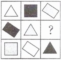 观察图形的排列规律,我们发现每行都有三种不同颜色的图形,并且每种颜色只出现一次。第一行是白三角形、黑正方形、灰长方形;第三行是灰正方形、白长方形、黑三角形。按照这种规律,第二行“?”处应填上一个白色的图形。此外,每行都有一个正方形,而第二行目前没有正方形,因此“?”处应是白正方形。