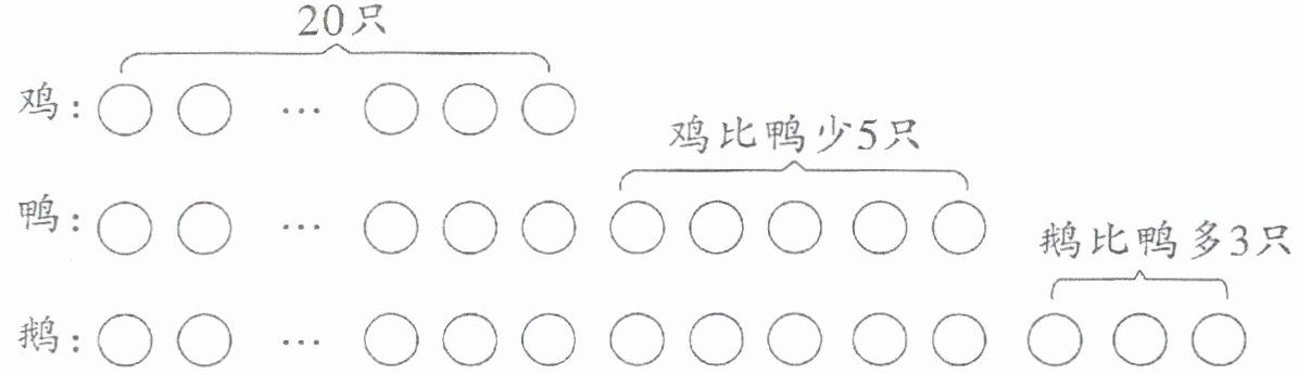 【解析】:根据题意,已知鸡有20只,鸡比鸭少5只,所以鸭的数量为鸡的数量加上5只,即$20 + 5 = 25$(只)。又因为鹅比鸭多3只,所以鹅的数量为鸭的数量加上3只,即$25 + 3 = 28$(只)。