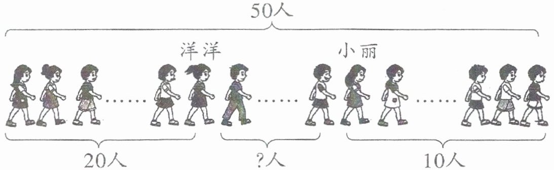 方法二:先算出包括小丽和洋洋在内的前后人数的和,即$10 + 20 = 30$人,再用队伍的总人数50人减去这个人数和,得到的就是小丽和洋洋中间的人数。