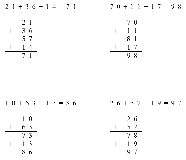 $21 + 36 + 14 = $ $70 + 11 + 17 = $ $10 + 63 + 13 = $