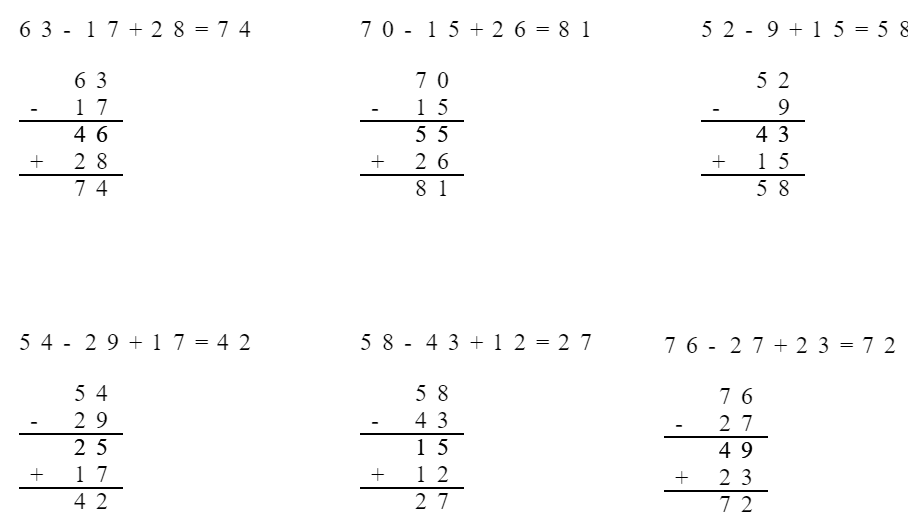 $63 - 17 + 28 = $ $70 - 15 + 26 = $ $54 - 29 + 17 = $