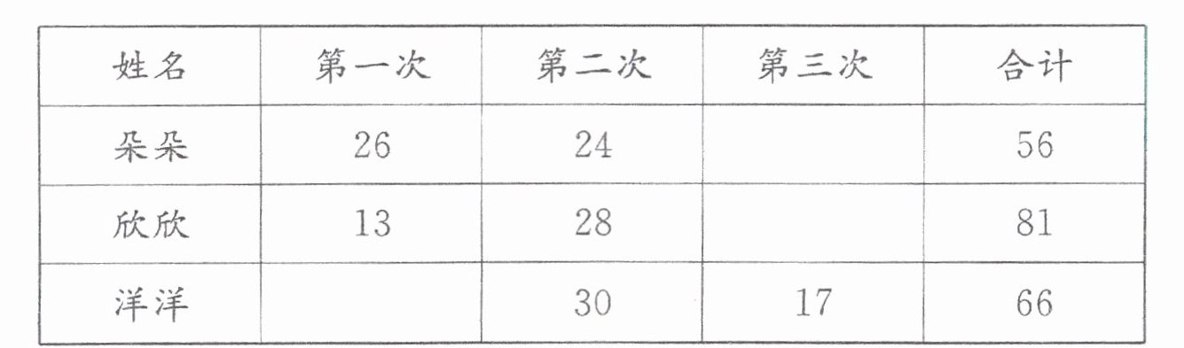 六、同学们参加踢毽子比赛,成绩如下,请将表格补充完整。(单位:下)