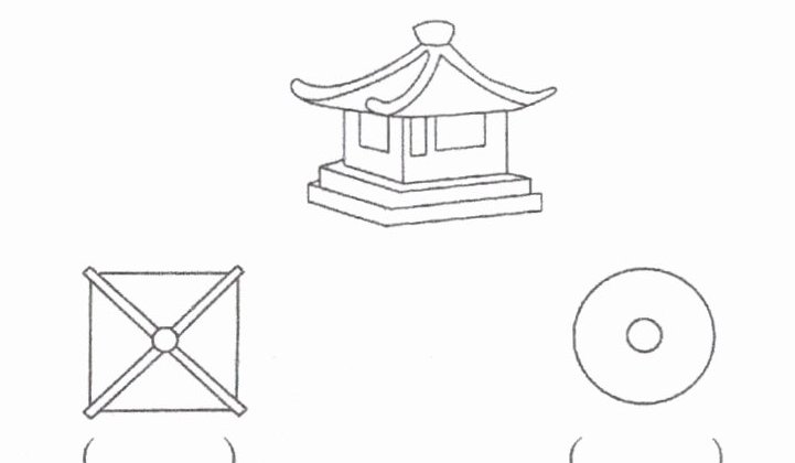 二、张叔叔在高楼上看下面的小亭子,看到的应该是哪种形状?在( )里画“√”。(4分)