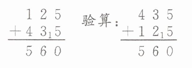 解$ 125 + 435 = 560 437 - 359 = 78\begin{array}{r}125 \\+4_{3}15 \\\hline560\end{array} $验算:$\begin{array}{r}435 \\+1_{2}15 \\\hline560\end{array} \begin{array}{r}\dot{4}\dot{3}7 \\-359 \\\hline78\end{array} $验算: