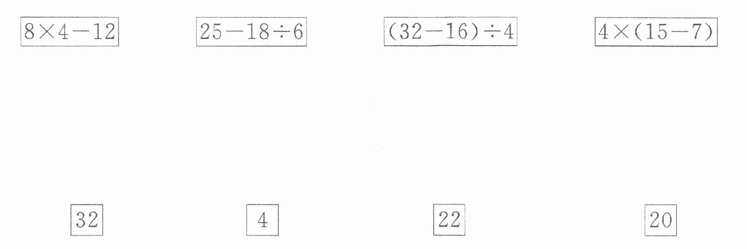 【答案】:8×4-12—20;25-18÷6—22;(32-16)÷4—4;4×(15-7)—32