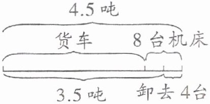 观察上图可知,4台机床重4.5-3.5= 1(吨),由此可以求出一台机床的质量,再从4.5吨减去8台机床的质量,就能求出货车的质量。解 4.5-3.5= 1(吨) 1吨= 1000千克 1000÷(8-4)= 250(千克)250×8= 2000(千克) 2000千克= 2吨 4.5-2= 2.5(吨)答:每台机床的质量是250千克,货车的质量是2.5吨。