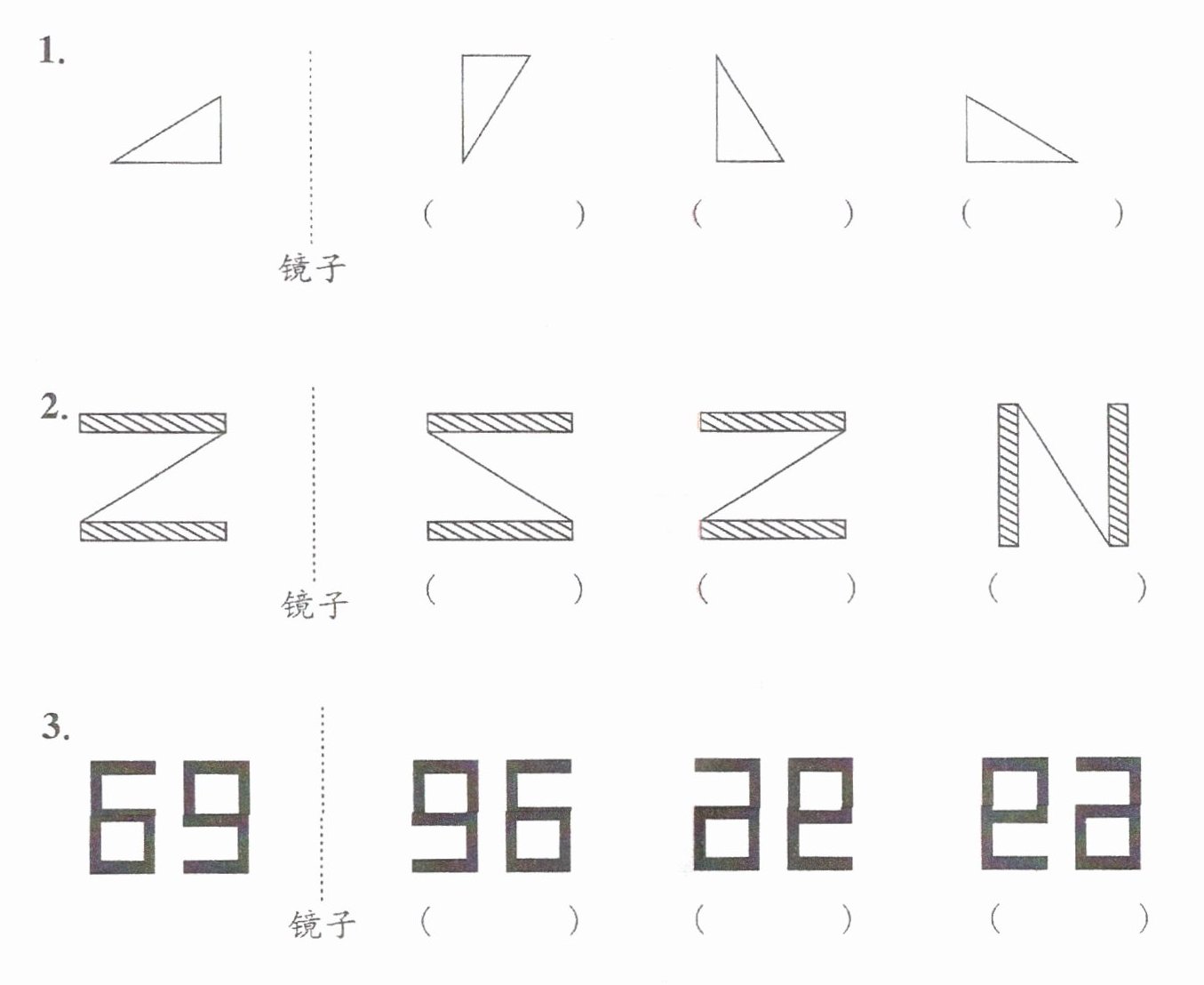 3. 原图形是“69”,镜面对称时,“6”会变成“9”,“9”会变成“6”,且左右顺序互换,所以镜中看到的是“69”左右互换并各自镜像后的“96”,与第一个图形一致。
