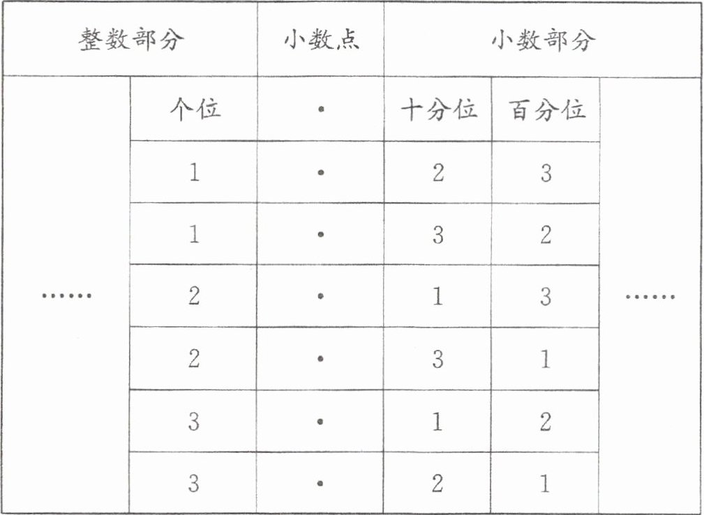 分析 方法一:先用 2,3,1 组成不同的三位数,即 123,132,213,231,312,321;然后在这些三位数的百位与十位之间点上小数点,就会得到要求的小数。