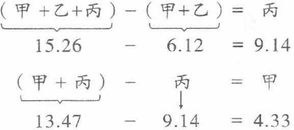 例 3 甲、乙、丙三个数的和是 15.26,甲、乙两个数的和是 6.12,甲、丙两个数的和是 13.47,甲数是多少?