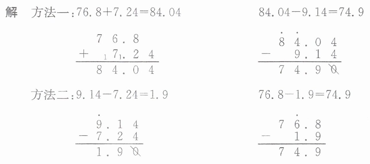 分析 方法一:在加法中,和随着加数的增减而增减,即一个加数增加 7.24,和也增加 7.24;另一个加数减少 9.14,和也减少 9.14。