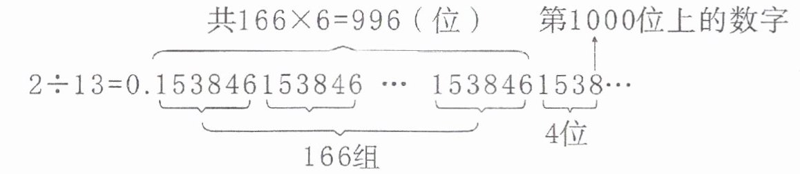 分析$ 2 ÷ 13 = 0. \dot { 1 } 5384 \dot { 6 } ,$商是一个循环小数,循环节由6个数字组成。要想知道商的小数点后面第1000位上的数字是几,就要用1000除以6的商来确定。