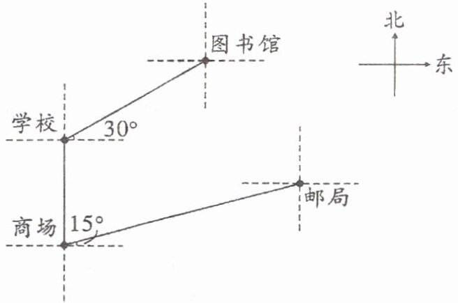 分析 确定以谁为观测点是解决本题的关键,想知道图书馆在学校的什么方向上,就以学校为观测点;想知道学校在商场的什么方向上,就以商场为观测点;想知道商场在邮局的什么方向上,就以邮局为观测点。再结合图中的角度信息即可解答。