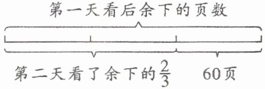 观察上面画的线段图发现,60页对应的是第一天看后余下页数的$(1 - \frac{2}{3})$,求第一天看后余下的页数应该用除法计算,即$60÷(1 - \frac{2}{3}) = 180$(页)。