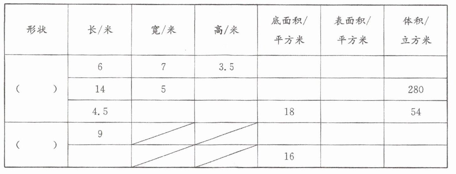 (注:因无法直接查看图片表格结构,根据答案推测表格应包含长方体和正方体的相关参数,以下为各计算结果对应项,实际填写需按图片表格行列位置匹配)