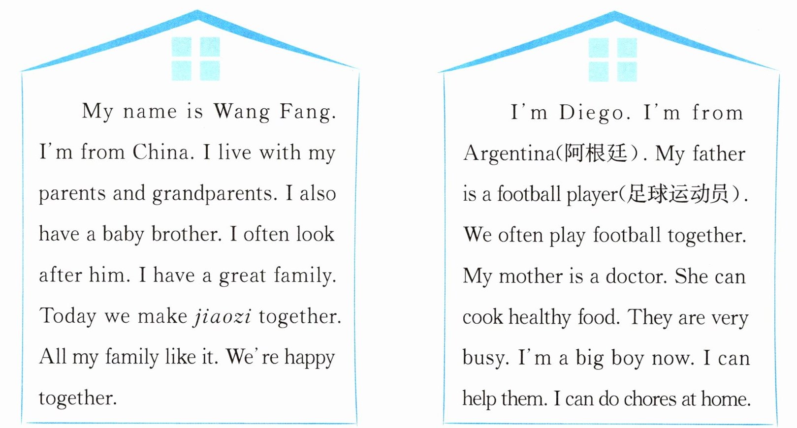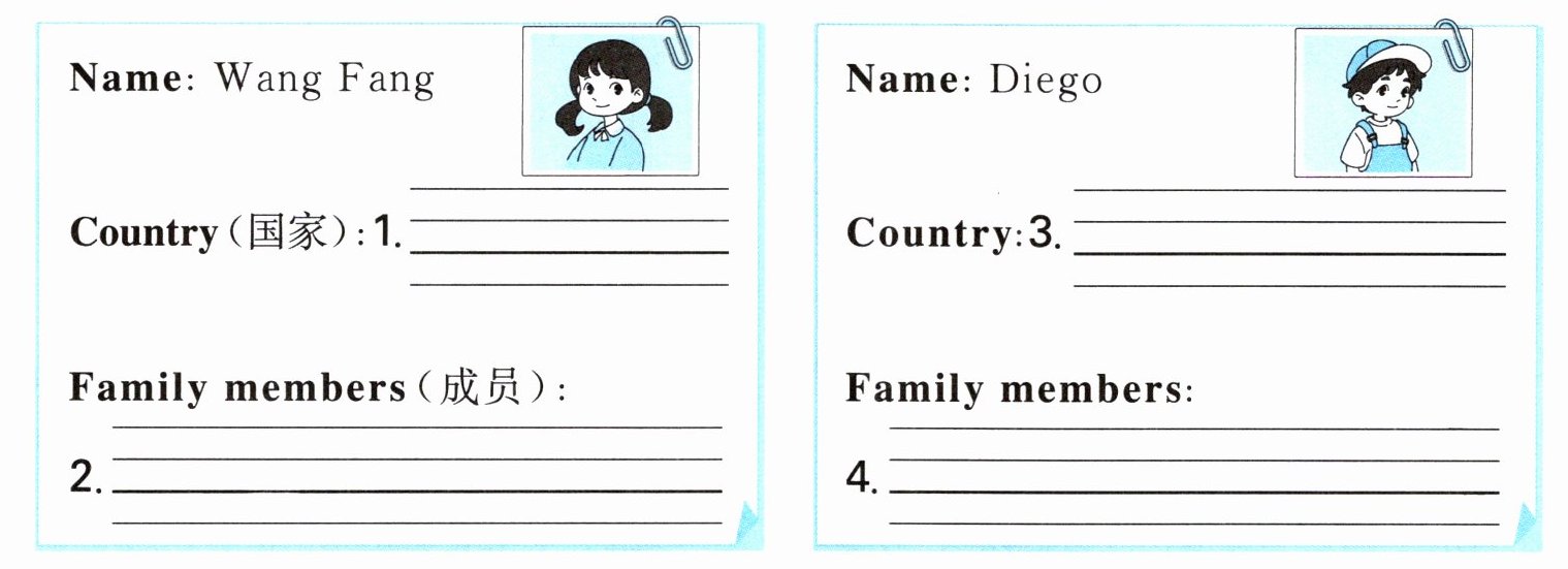 任务一:阅读家庭介绍,找出相应的内容补全王芳和 Diego 的信息表。