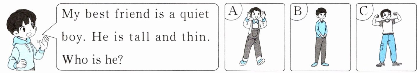 B 解析 句意:我最好的朋友是一个文静的男孩。他又高又瘦。他是谁? 分析:根据图片可知,A图中的男孩活泼搞怪,C图中的男孩身材健壮,两幅图中的人物形象与描述不符。B图中的男孩又高又瘦,且很文静,故圈出B。