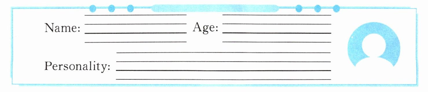 示例:Name:Tina Age:eleven Personality:quiet,friendly