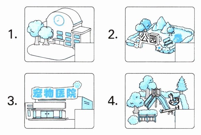 一、Ada 在友善社区看到了完备的场所设施。根据图中的场所,选择相应的句子。