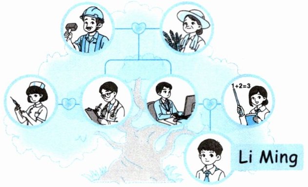 三、李明制作了家庭职业树。根据职业树,选择正确的内容补全他的介绍。