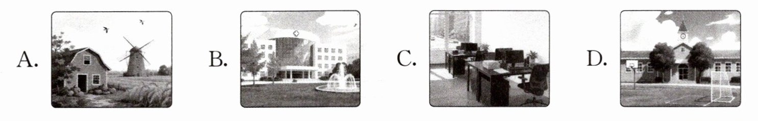 4. 句意:我是一位护士。我在 工作。分析:护士在医院工作,故选 B。