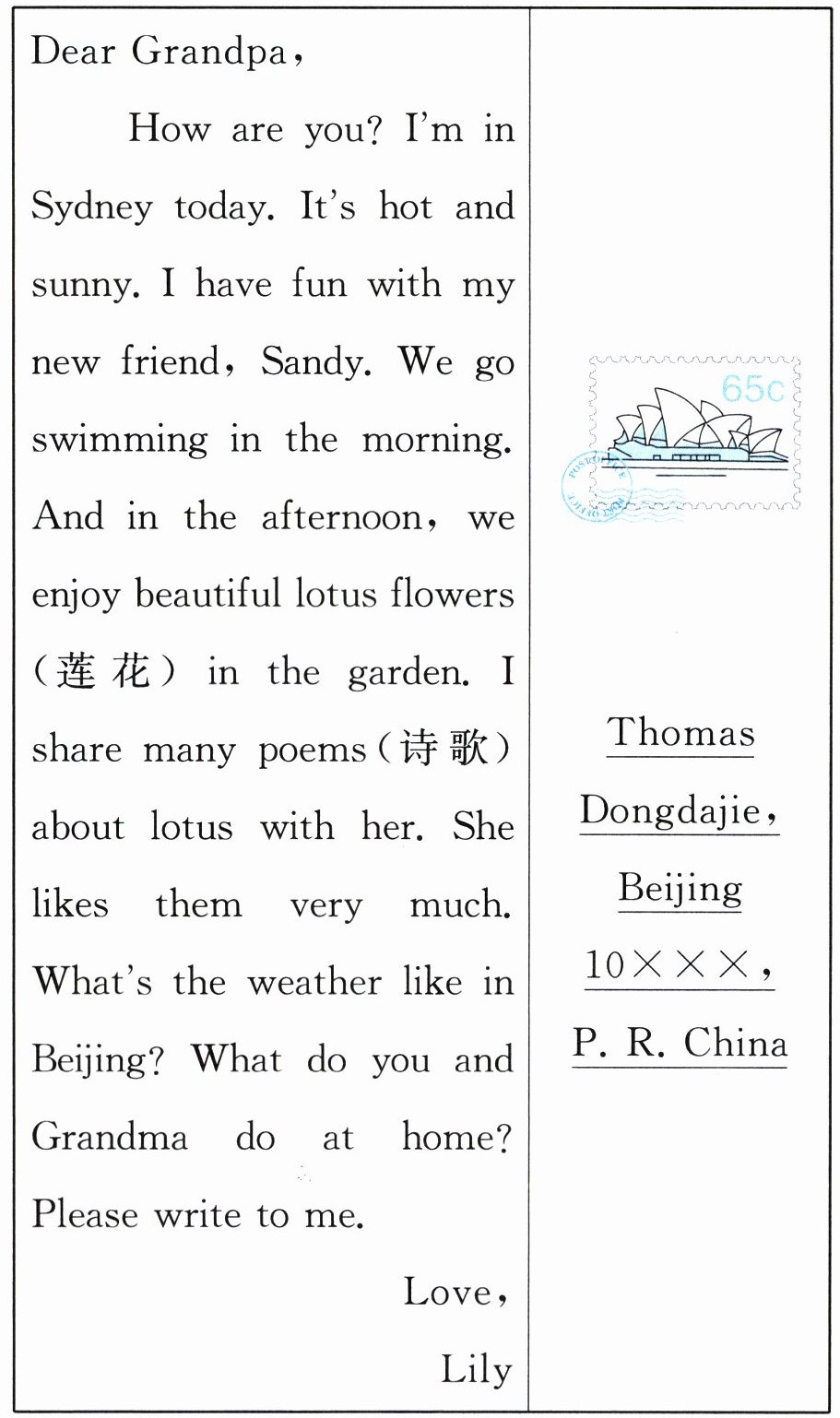 )4. The postcard is about ______.A. Lily's activities B. Lily's friend C. the weather in Sydney