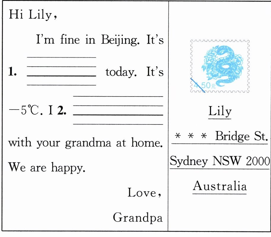 任务二:外公正在给 Lily 回信。根据所给内容,选词补全明信片。(4分)