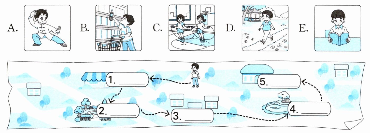 三、听录音,根据游览路线,选择相应的活动,将序号填在横线上。