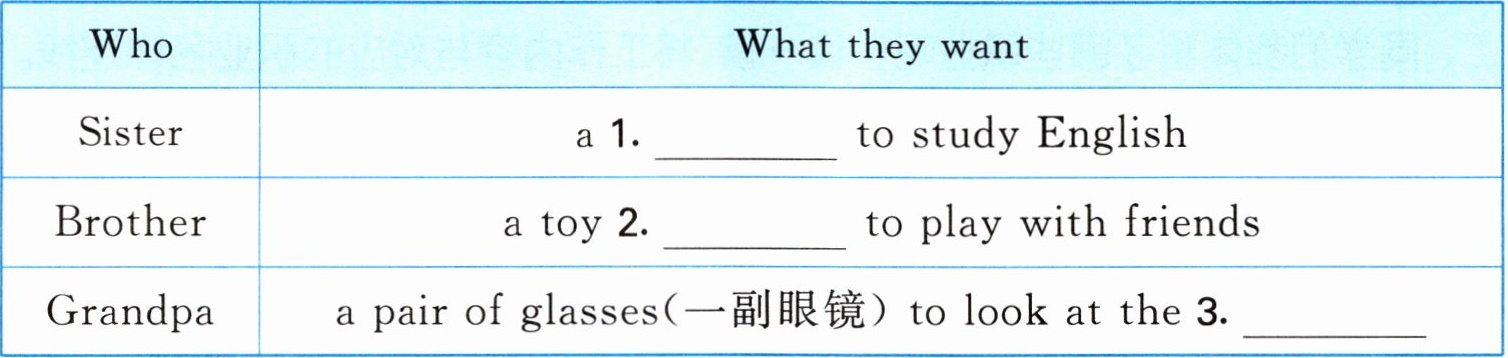 二、听录音,根据韵文写出相应的单词,完成家人的购物清单。