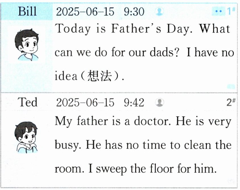 任务一:1. A 2. C 3. A 4. B 任务二:示例:I can clean the room for my dad.