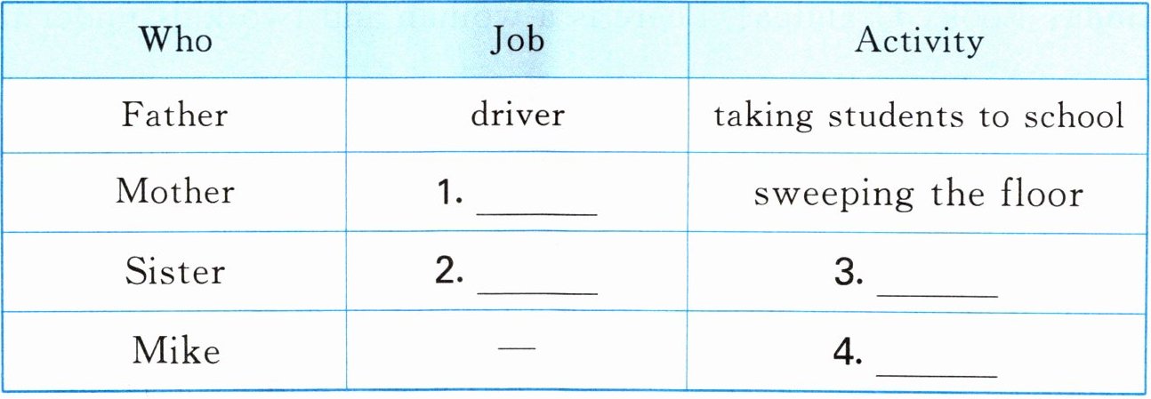四、Mike一家经常参加志愿活动。听录音,选择正确的选项完成表格。