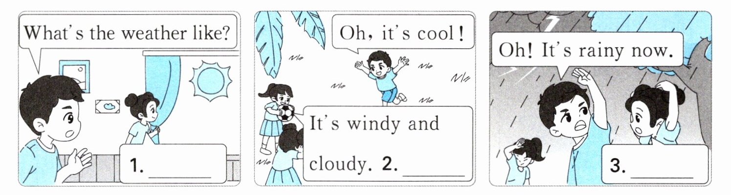 一、观察雨天中人们的活动。看图,选择相应的对话。