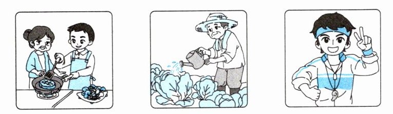解析 1. 句意:这位农民种植蔬菜。分析:关键信息为farmer(农民),故在第二幅图下标1。2. 句意:我经常和我的奶奶一起烹饪。分析:关键信息为cook(烹饪),故在第一幅图下标2。3. 句意:我能打扫我的房间。分析:关键信息为clean my room(打扫我的房间),故在第四幅图下标3。4. 句意:我爸爸今天很忙,他现在很疲倦。分析:关键信息为busy(忙碌的)和tired(疲倦的),故在第五幅图下标4。5. 句意:这是王老师,他教我体育。分析:关键信息为teaches me PE(教我体育),故在第三幅图下标5。