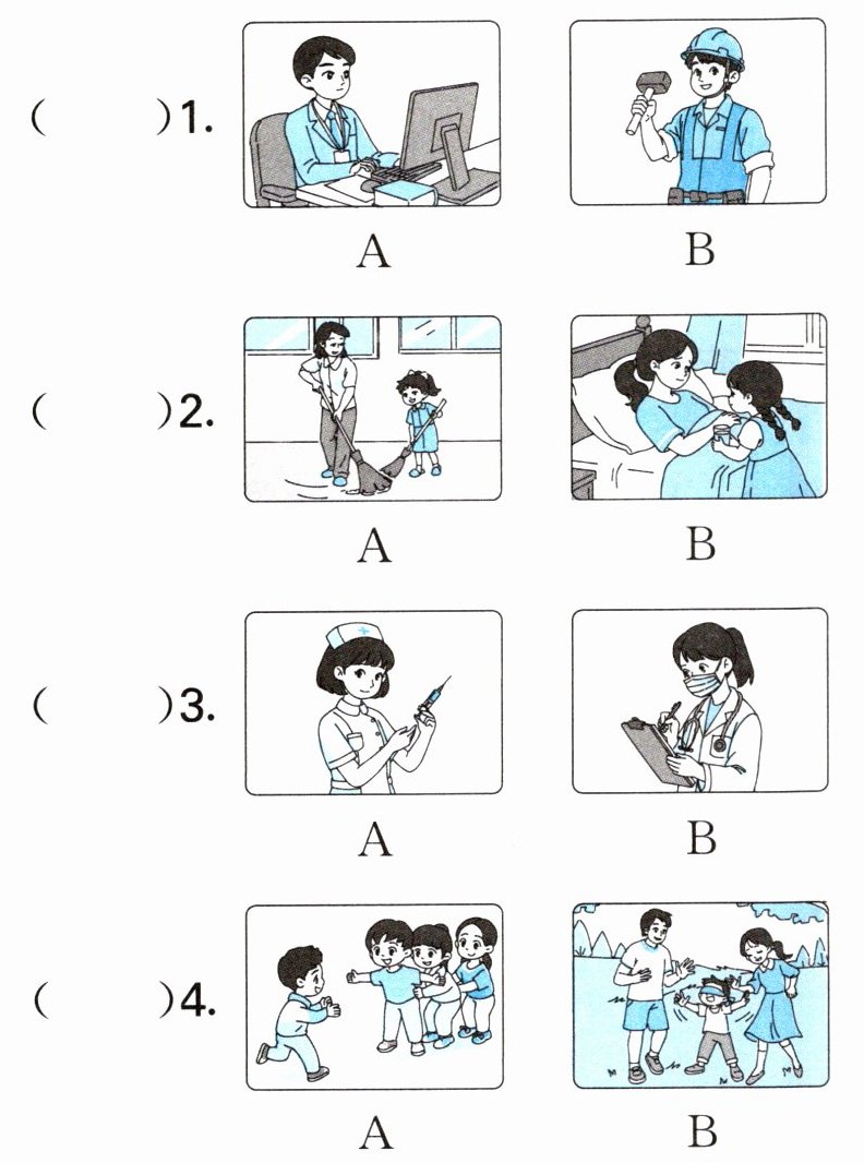 解析 1. 句意:我爸爸是一位公司职员。分析:关键信息为office worker(公司职员),故选A。2. 句意:我和妈妈一起扫地。分析:关键信息为sweep the floor(扫地),故选A。3. 句意:我姑姑是一位伟大的医生。分析:关键信息为doctor(医生),故选B。4. 句意:我们一家人在一起很开心。分析:关键信息为family(家人)和happy together(在一起很开心),故选B。