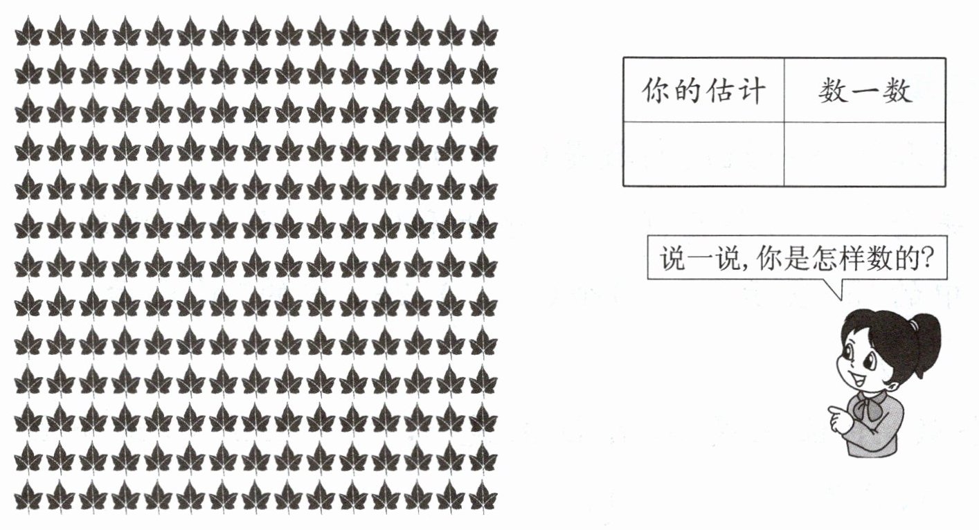 【解析】:通过观察插图可知,树叶排列成整齐的行列。先数出每行树叶的数量,经仔细观察每行有15片树叶;再数出行数,共有15行。根据乘法的意义,用每行的树叶数乘以行数,即可求出树叶的总数,列式为$15×15$。计算可得$15×15 = 225$(片)。