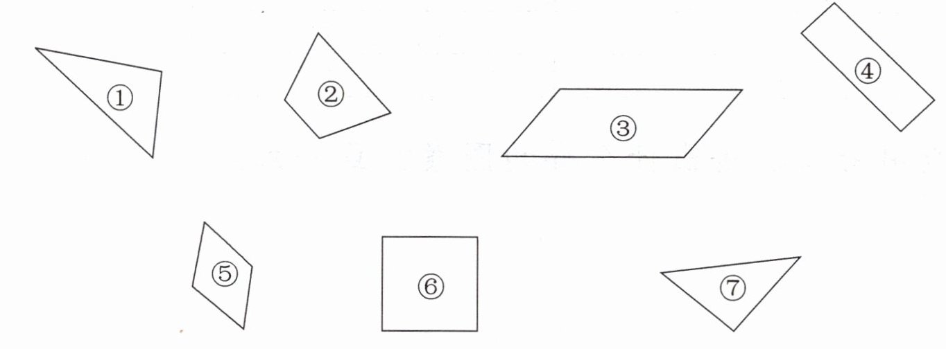图形①⑦有3条边,是三角形;图形②⑤有4条边,且4条边都不相等,是不规则四边形;图形③④⑥有4条边,且相对的边平行且相等,是平行四边形(其中⑥是特殊的平行四边形,即正方形)。