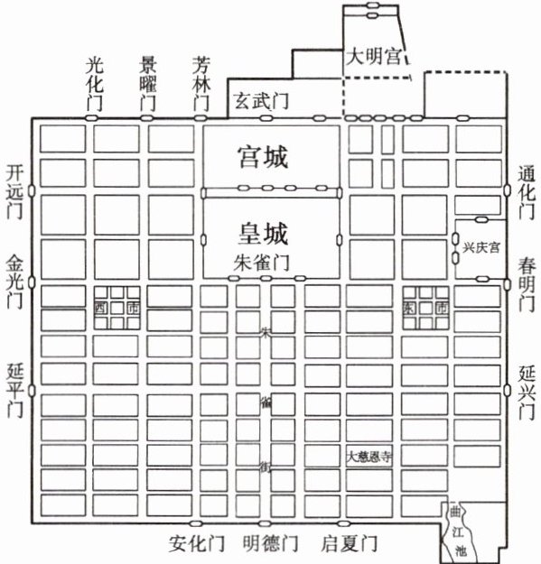 (1) 唐朝。长安城内分为坊和市,坊是居民住宅区,市是商业区。