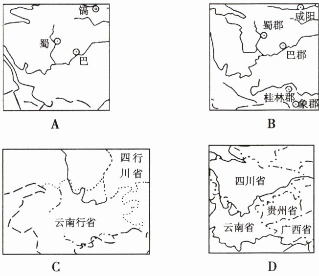 D选项:地图中有“四川省”“贵州省”“广西省”等,这是明朝或清朝时期的地方行政区划,明朝和清朝虽然也是统一政权,但不是中国古代少数民族开创的第一个全国性统一政权,所以D选项错误。