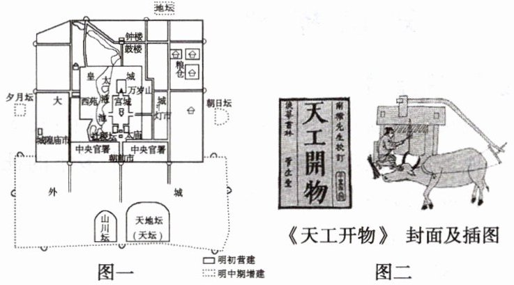 (1)明朝的北京城。明长城。(2)宋应星。(3)李时珍。其著作是一部具有总结性的药物学巨著。(4)建筑和科技著作领域。宋元时期是我国古代科技发展的高峰时期。创新性的科技发明比较多,如活字印刷术、指南针等。明清时期,对传统古典科技的总结居多,对近代自然科学的运用和发展尚少,潜藏着发展停滞的危机。(言之有理,符合实际即可)