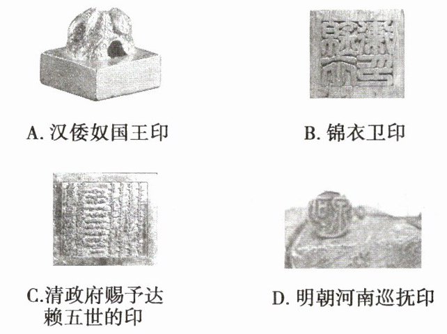 【解析】:本题以印信为切入点,考查理解能力。解答本题需把握“中央政府有效加强对少数民族地区管辖”这一条件。A项“汉倭奴国王印”反映的是汉与日本的交往,并非对少数民族地区的管辖;B项“锦衣卫印”是明朝设立的特务机构,与少数民族地区管辖无关;C项“清政府赐予达赖五世的印”,顺治帝赐予五世达赖“达赖喇嘛”封号,康熙帝后确立册封制度,体现了中央政府对西藏这一少数民族地区的有效管辖;D项“明朝河南巡抚印”中河南是汉族聚居地区,不符合少数民族地区的条件。综上,C项符合题意。