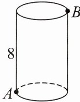 8. 如图,一圆柱高 $ 8 \mathrm { cm } $,底面半径为 $ \frac { 6 } { \pi } \mathrm { cm } $,一只蚂蚁从点 $ A $ 爬到点 $ B $ 处吃食,需要爬行的最短路程是 ______